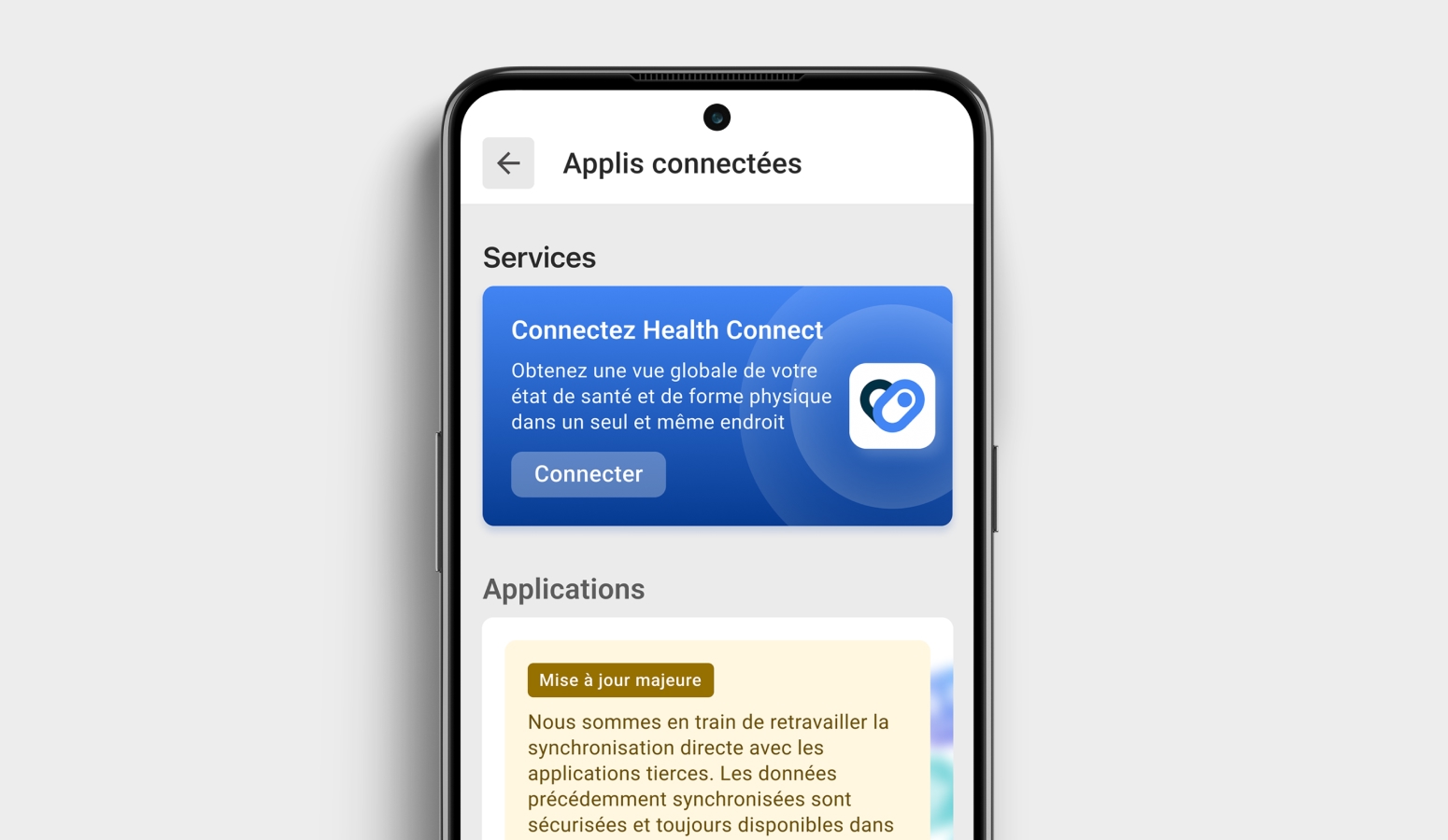 Utilisateurs d'Android : les utilisateurs d'Android reçoivent une notification push pour se connecter à Health Connect, suivie d'une installation guidée simple. Les connexions existantes à l'app restent actives, de sorte qu'aucune donnée n'est perdue.