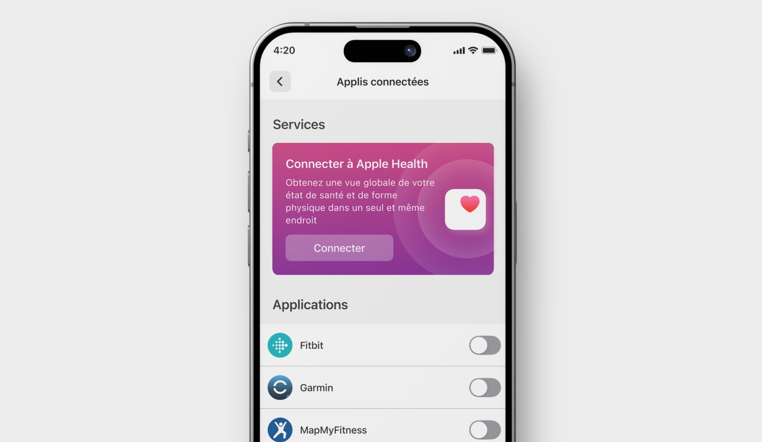 Utilisateurs d'Apple : aucune action n'est requise s'ils sont déjà connectés à Apple Health. Leurs données sont conservées en toute sécurité et continuent d'être synchronisées de manière transparente.