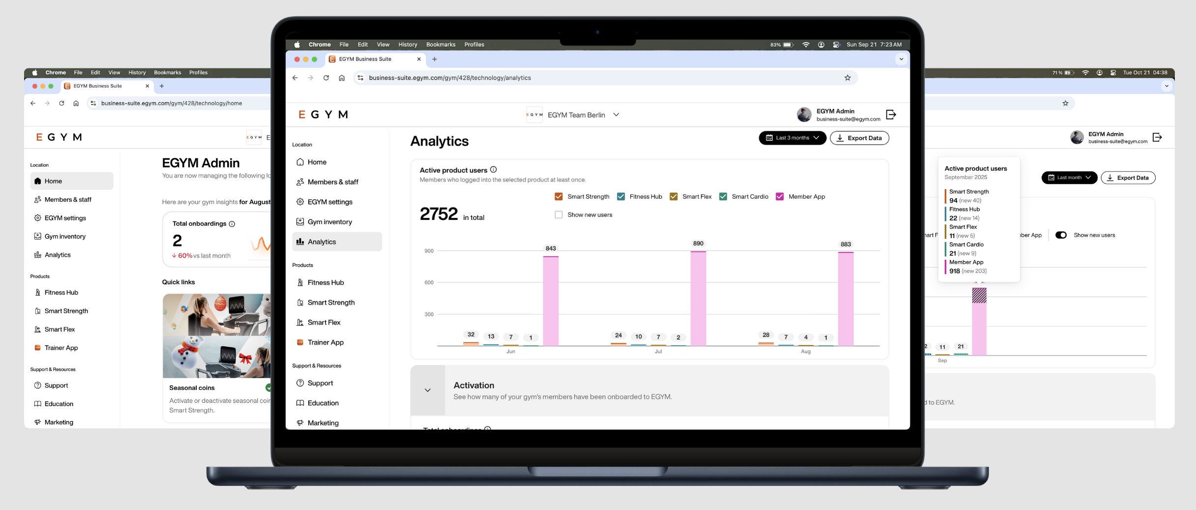 - Efficacité opérationnelle : Gérez l’ensemble de votre écosystème EGYM — moins de complexité, plus d’efficacité et un focus clair sur la croissance.