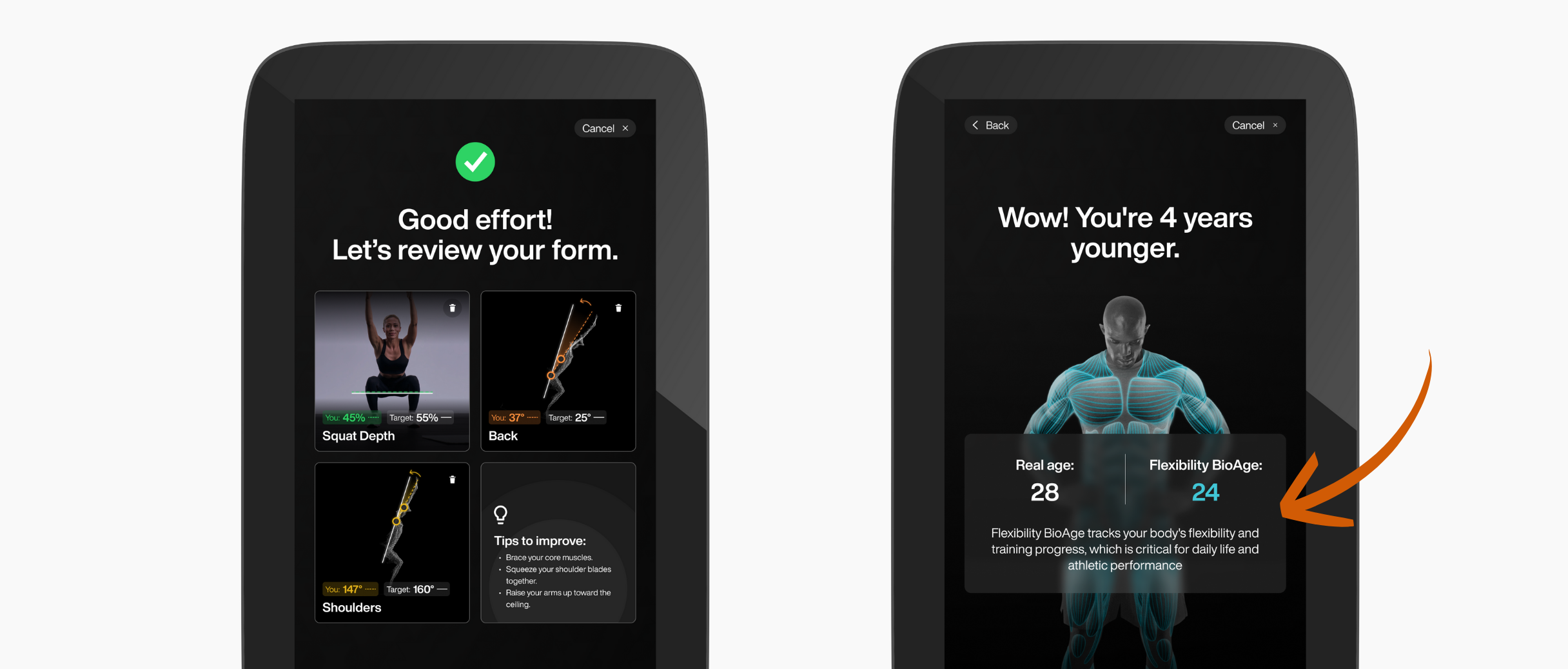 Les résultats du test de flexibilité du squat sont également pris en compte dans le composant de flexibilité du BioAge. Les adhérents peuvent affiner leur âge de manière flexible en effectuant des tests de flexibilité supplémentaires. En répétant le test de flexibilité du squat au fil du temps, vous enregistrez les données relatives à vos progrès, ce qui vous permet de visualiser les améliorations de la profondeur du squat, de la mobilité des épaules et du dos.