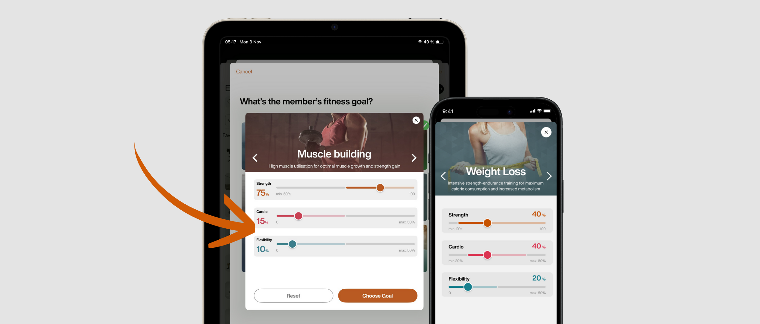 Auparavant, la composition était prédéterminée. Désormais, vos coachs ou vos adhérents eux-mêmes peuvent ajuster l’équilibre dans des limites définies, en fonction des objectifs individuels, du niveau de forme et des préférences. Qu’il s’agisse de récupération après une blessure, de la priorisation des objectifs ou d’autres besoins spécifiques, coachs et adhérents peuvent désormais affiner leurs préférences, le tout sans changer d’objectif. Principaux avantages Exploitants : bénéficiez d’une équipe plus efficace et d’adhérents satisfaits et engagés, plus enclins à suivre leurs plans d’entraînement. Coach : gagnez du temps et plus d’autonomie grâce à l’intégration et à la création de plans avec Genius. Ils peuvent travailler plus efficacement et adapter les plans plus précisément aux besoins de chaque adhérent.