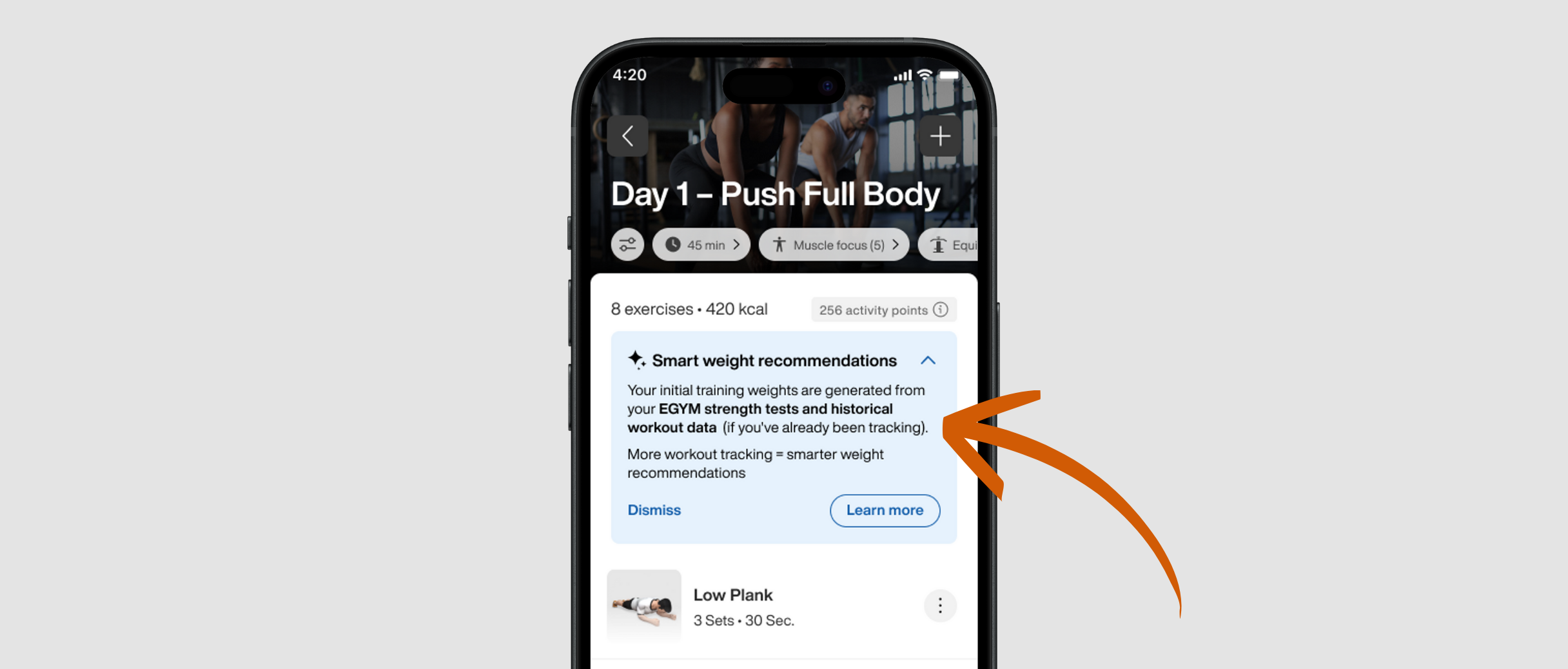 La nouvelle Info Box dans les plans d’entraînement Genius explique comment les charges de départ sont déterminées — particulièrement utile pour les nouveaux adhérents. Lorsqu’un adhérent commence un plan Genius sans beaucoup d’historique d’entraînement, Genius utilise les données disponibles, comme les tests EGYM Smart Strength ou les entraînements précédemment suivis, pour estimer une charge de départ. Il s'agit d'une approximation intelligente basée sur des données limitées, mais qui n'est pas encore totalement personnalisée. Au fur et à mesure des séances d'entraînement, Genius affine continuellement les recommandations pour mieux correspondre au niveau de condition physique réel de l’adhérent.