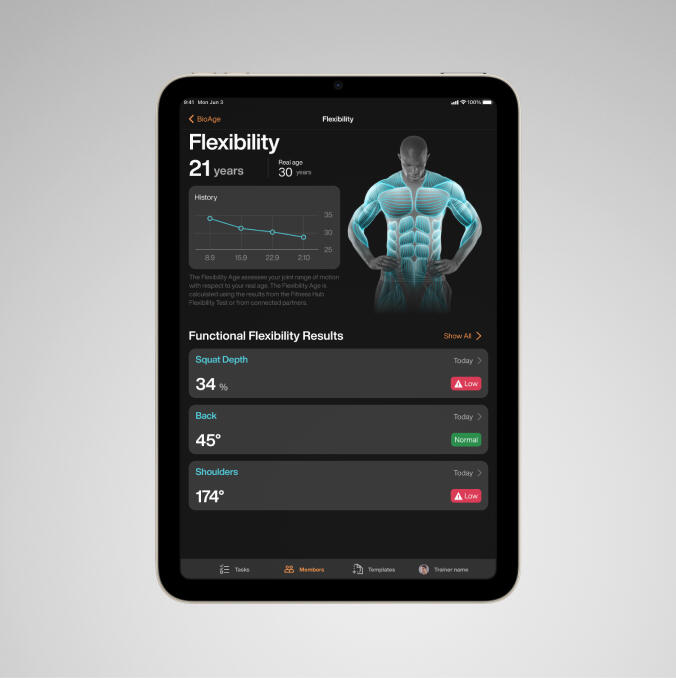 Nous savons que les informations basées sur les données sont essentielles. Les exploitants de clubs ont besoin d’une vue d’ensemble globale, les coachs ont besoin d’informations détaillées sur chaque adhérent. Grâce aux nouvelles informations d’EGYM Flexibility BioAge